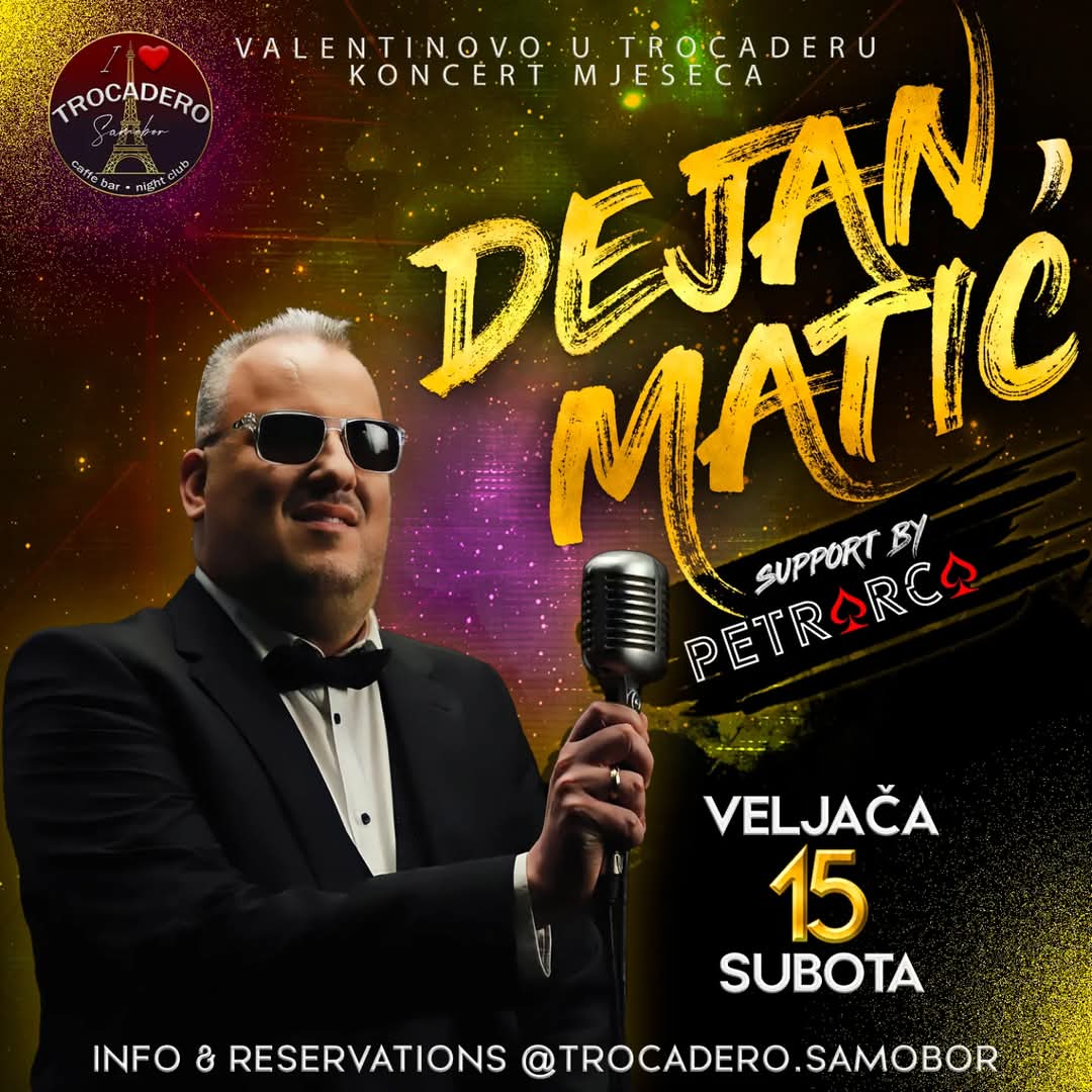Ako tražite savršen način da proslavite Valentinovo, ne propustite koncert mjeseca u Trocaderu Samobor! U subotu, 15. veljače, na pozornicu dolazi Dejan Matić, jedan od najpopularnijih izvođača u regiji. Očekuje vas večer ispunjena emocijama, najvećim hitovima i nezaboravnom atmosferom!