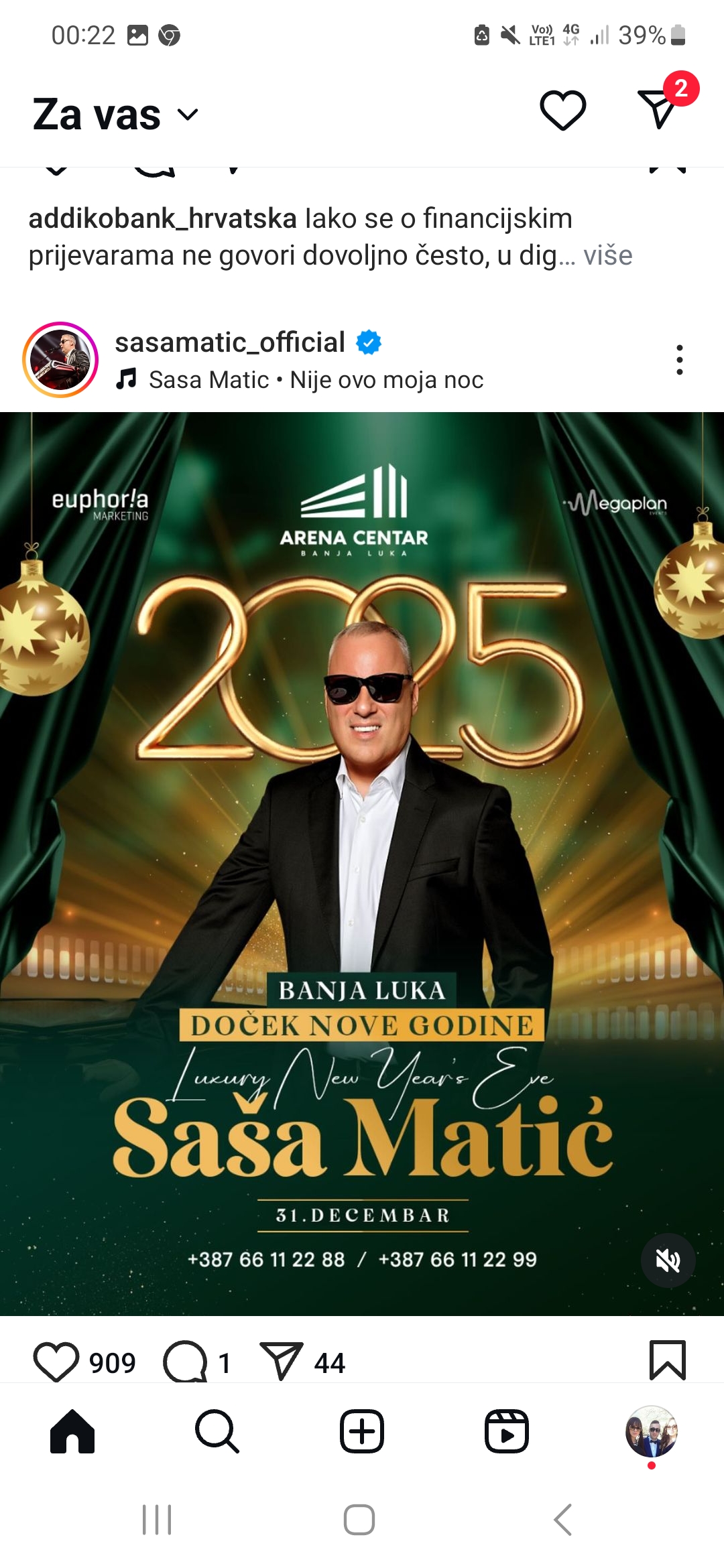 Pripremite se za spektakularan doček Nove Godine u Banja Luci uz nezaboravni koncert Saše Matića! Ove godine, Arena Centar u Banja Luci bit će domaćin luksuznog novogodišnjeg programa koji će oduševiti sve ljubitelje vrhunske zabave i glazbe. Proslavite ulazak u 2025. uz najveće hitove jednog od najpopularnijih izvođača regije.