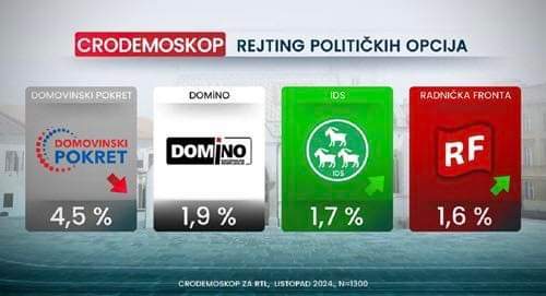 Istraživanje CROdemoskopa potvrđuje kontinuiran pad popularnosti DP-a, što se pripisuje gubitku povjerenja njihovih birača. Ovi birači sada prepoznaju DOM i NACIONALNO OKUPLJANJE kao novu snagu koja nudi alternativu. Rejting DP-a pada ispod izbornog praga, a nova stranka čvrsto gradi svoje pozicije na političkoj sceni.