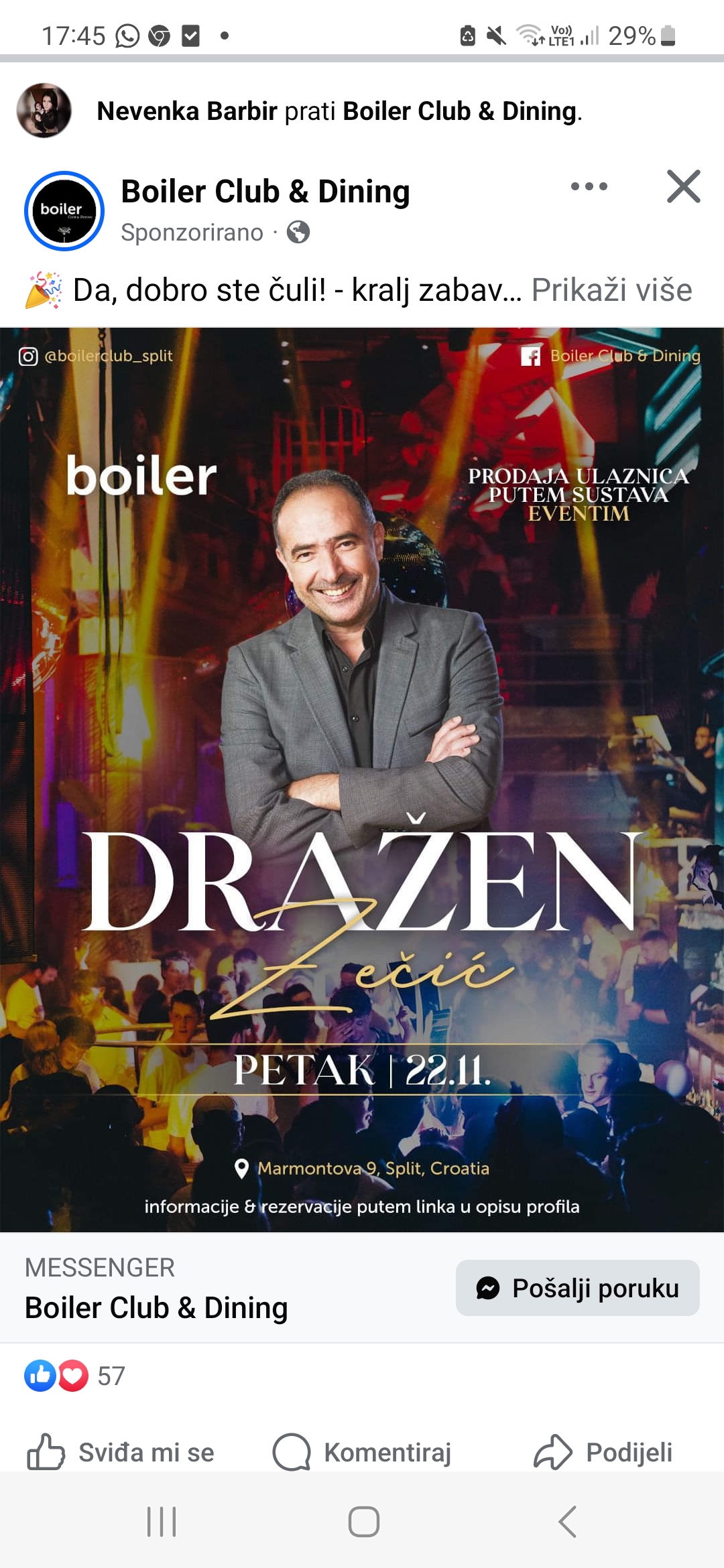 Ako ste ljubitelj glazbe Dražena Zečića, ovo je prilika koju ne smijete propustiti! U petak, 22. studenog, legendarni pjevač i kralj zabave nastupit će u popularnom klubu Boiler Club & Dining na adresi Marmontova 9, Split. Očekujte večer ispunjenu hitovima koje svi volimo pjevati – od „Nitko nema dva života“ do „Govore mi ljudi“!