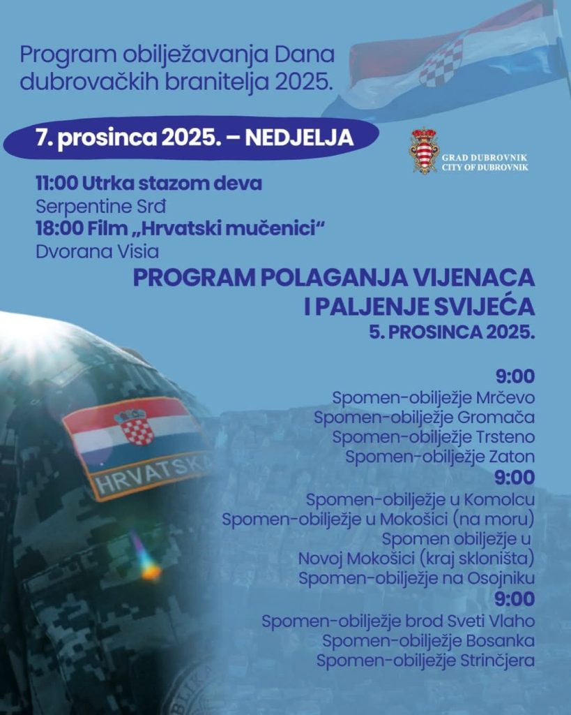 Poseban raspored predviđen je i za 5. prosinca, kada će se u 9:00 sati na više gradskih lokacija polagati vijenci i paliti svijeće kod brojnih spomen-obilježja, uključujući Mokošicu, Trsteno, Zaton, Komolac, Bosanku, Brdo Svetog Vlaha i druga mjesta.