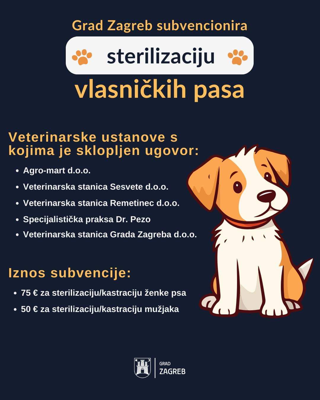 Subvencija je namijenjena vlasnicima pasa koji žive u Zagrebu i žele sterilizirati ili kastrirati svoje ljubimce. Grad Zagreb subvencionira postupke sterilizacije u ugovorenim veterinarskim ustanovama, što omogućava značajno smanjenje troškova za vlasnike pasa.