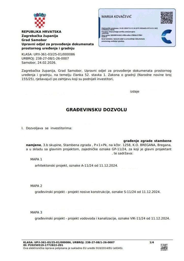 Građevinsko zemljište Samobor (Bregana) – 380 m², projekt + pravomoćna dozvola (2 stambene jedinice)