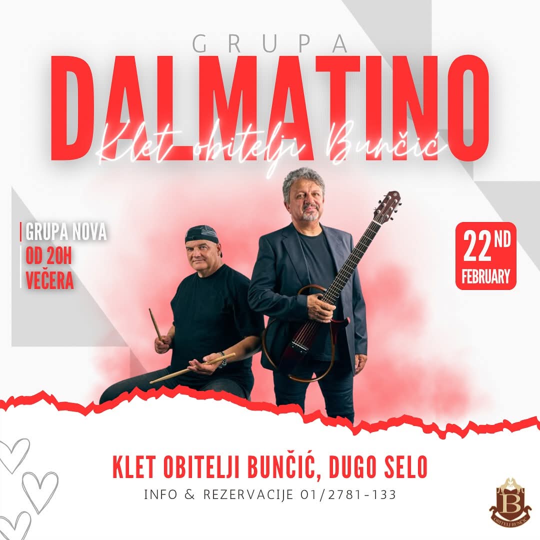 Grupa Dalmatino, poznata po hitovima koji diraju srce i dušu, nastupa uživo u Kleti obitelji Bunčić u Dugom Selu 22. veljače 2025. godine. Ovaj glazbeni spektakl počinje u 20:00 sati, a uz koncert posjetitelje očekuje i ukusna večera.