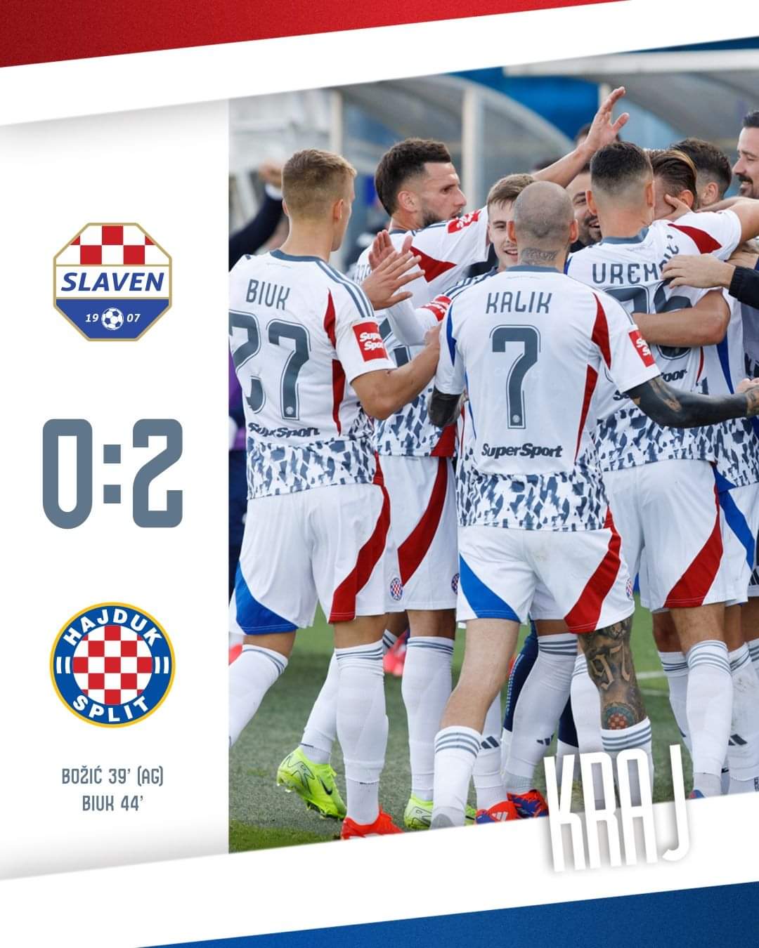 Ova pobjeda dodatno jača Hajduk Split na putu ka vrhu tablice, a ključni trenuci utakmice, autogol Božića i gol Biuka, sigurno će se pamtiti.