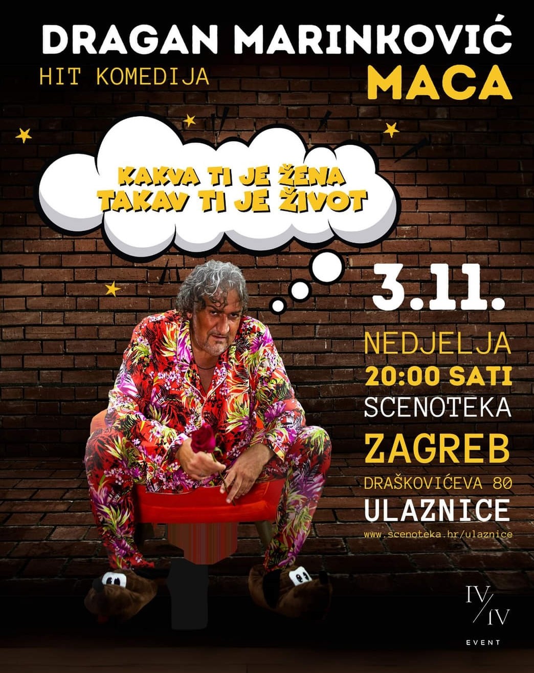Predstava će se održati u nedjelju, 3. studenog, s početkom u 20:00 sati, u Scenoteci na Draškovićevoj 80.Ova urnebesna komedija osvojila je srca publike diljem regije i donosi nepresušan humor na temu muško-ženskih odnosa. Maca, poznat po svom osebujnom stilu i nevjerojatnom smislu za humor, kroz predstavu vješto komentira svakodnevni život, brak, i ljubavne zavrzlame. Ako ste spremni za večer ispunjenu smijehom i zabavom, ovo je događaj koji ne smijete propustiti!Ulaznice za Macinu hit komediju “Kakva ti je žena, takav ti je život” dostupne su putem web stranice Scenoteke. Požurite i osigurajte svoje mjesto jer je interes za predstavu velik!