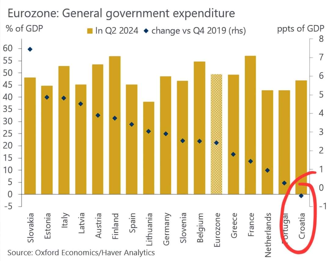 Hrvatska se istaknula kao jedina država Eurozone koja je u posljednjih nekoliko godina uspjela smanjiti ukupnu potrošnju državnih razina u odnosu na BDP. Prema najnovijim podacima iz 2024. godine, opća potrošnja vlade u Hrvatskoj, koja uključuje središnju i lokalnu razinu, zabilježila je pad u usporedbi s razinom iz 2019. godine. Ovaj podatak postavlja Hrvatsku u jedinstvenu poziciju unutar Eurozone, gdje ostale zemlje bilježe rast ili stagnaciju u državnoj potrošnji.