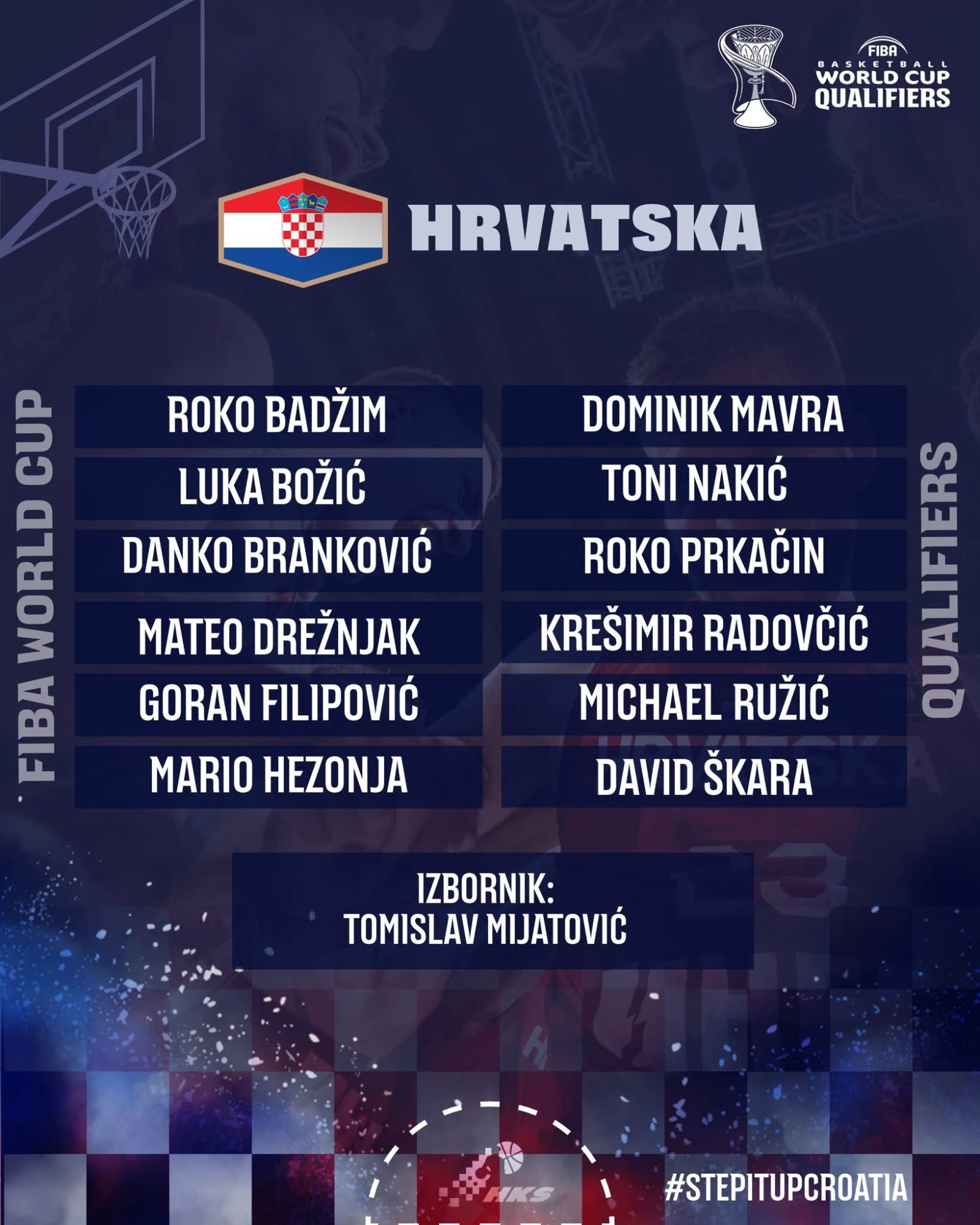 Hrvatska košarkaška reprezentacija objavila je konačan popis igrača za nadolazeće FIBA World Cup kvalifikacije. Izbornik Tomislav Mijatović pozvao je snažan i uravnotežen sastav u kojem se ističu velika imena europske košarke, ali i nekoliko novih reprezentativnih aduta spremnih dokazati se na najvišoj razini.