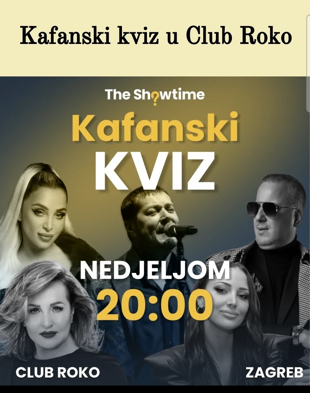 Tražite li savršen način za opuštanje i zabavu u nedjelju navečer? Club Roko u Zagrebu predstavlja uzbudljiv Kafanski Kviz, koji će se održavati svake nedjelje u 20:00 sati. Ovaj kviz, koji kombinira odličnu muziku i zabavna pitanja, savršena je prilika da se okušate u društvenom natjecanju sa prijateljima.Zašto Posjetiti Kafanski Kviz u Club Roko?Kafanski kviz pruža jedinstvenu atmosferu koja podsjeća na stare kafanske večeri, uz dodatak intelektualnog izazova. Okupljajući ljude svih uzrasta, ovo je događaj koji spaja ljubitelje muzike, kulture, i dobrog društva. Uz energičnu muziku i dinamične voditelje, nedjeljne večeri u Club Roko postat će nezaobilazna destinacija za sve koji vole kvizove.Format Kviza i Kako SudjelovatiKviz počinje točno u 20:00, a format uključuje pitanja iz različitih kategorija, uključujući muziku, film, sport i opću kulturu. Bilo da ste ljubitelj kvizova ili samo tražite opuštenu atmosferu za druženje, “Kafanski Kviz” nudi nešto za svakoga. Potrebno je prijaviti svoj tim unaprijed kako biste osigurali mjesto i spremni se natjecati za nagrade!O Club Roko u Zagrebu.