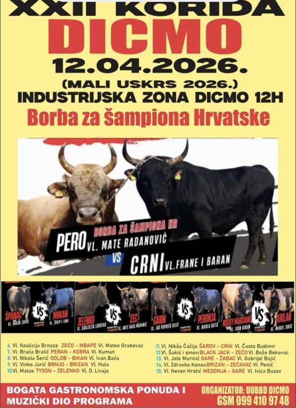 ByGradeMoj14 travnja, 2026Dicmo 12.04.2026. domaćin XXII koride. Borba za šampiona Hrvatske, vrhunski bikovi, gastronomska ponuda i glazbeni program. Dicmo 12. travnja 2026. ponovno postaje središte...