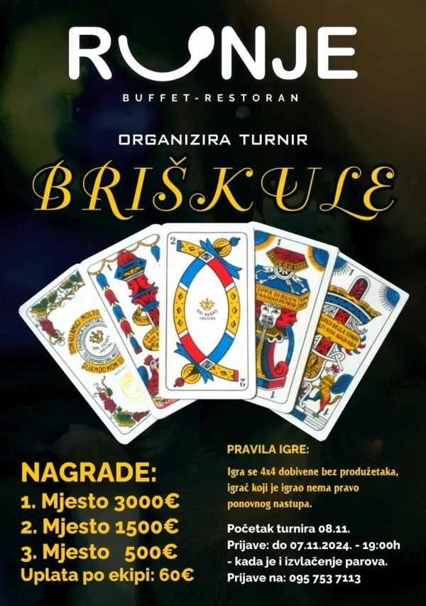 ByGradeMoj30 listopada, 2024Buffet Restoran Runje u Zmijavcima organizira veliki turnir u briškuli s primamljivim novčanim nagradama. Svi ljubitelji ove tradicionalne kartaške igre imat će priliku...