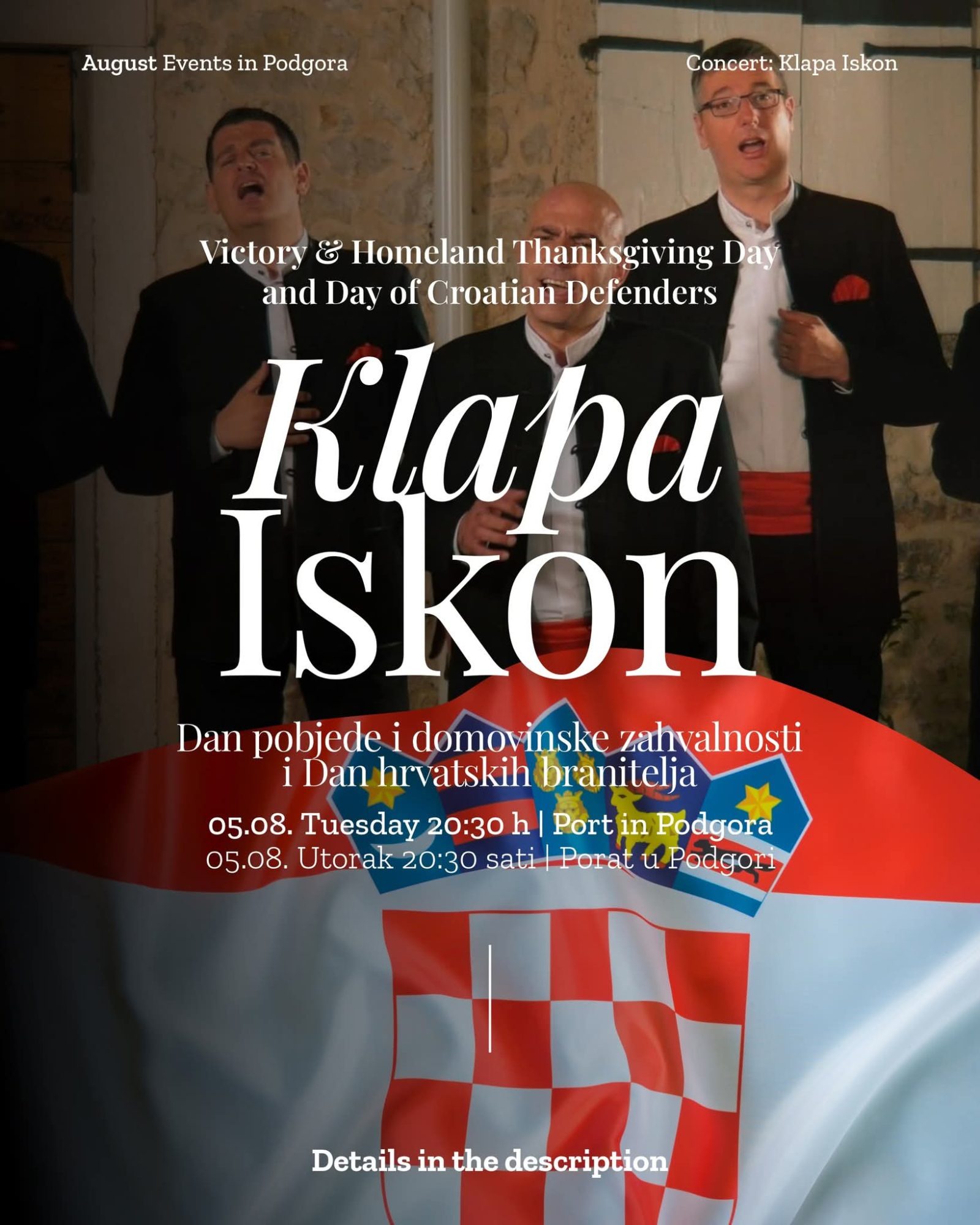 U ponedjeljak, 5. kolovoza 2025., u sklopu obilježavanja Dana pobjede i domovinske zahvalnosti te Dana hrvatskih branitelja, Podgora postaje domaćin nezaboravnog glazbenog događaja. Na pozornicu u luci u Podgori (Porat) izlazi jedna od najpoznatijih klapa u Hrvatskoj – Klapa Iskon.