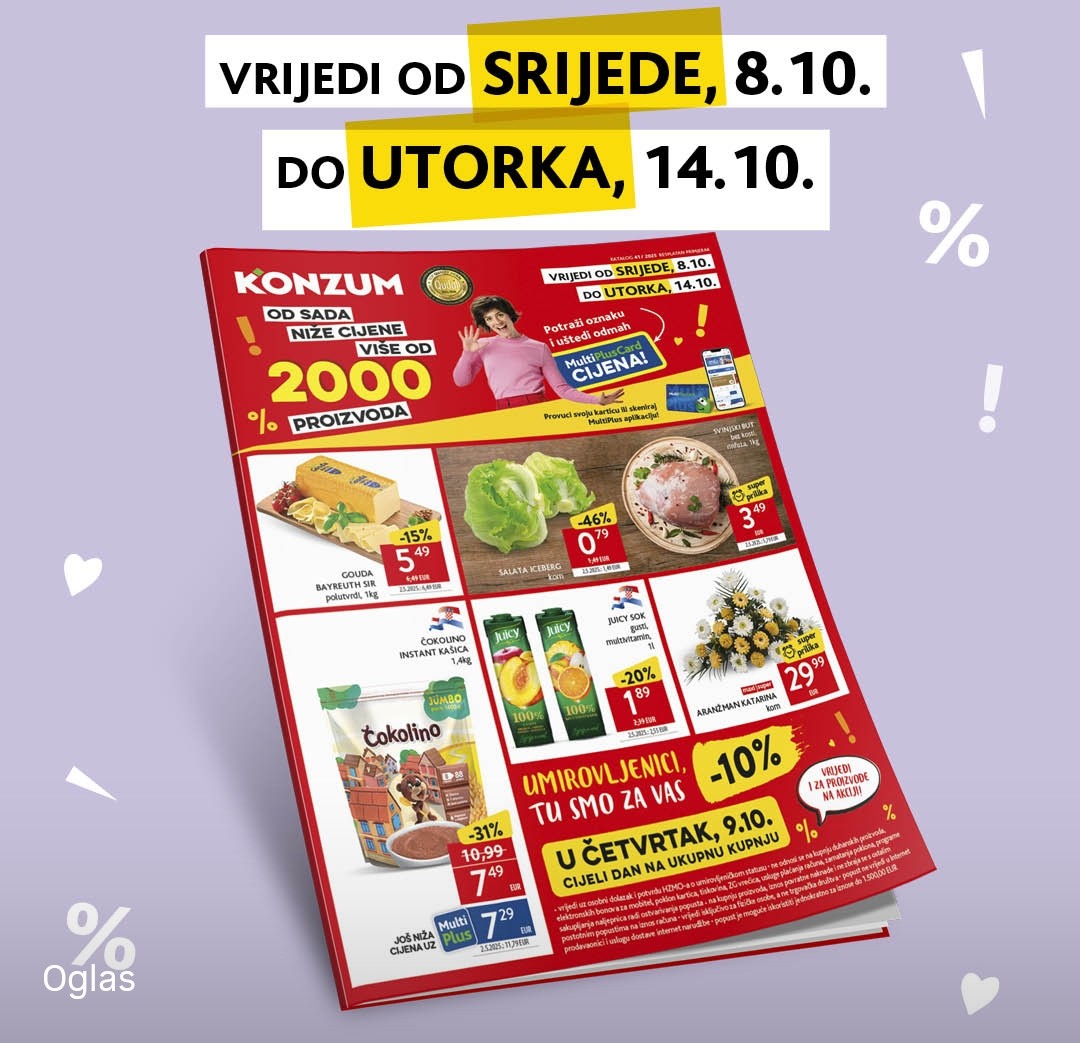 Konzum je pripremio novu tjednu akciju koja traje od srijede, 8. listopada do utorka, 14. listopada, s više od 2000 proizvoda po nižim cijenama!