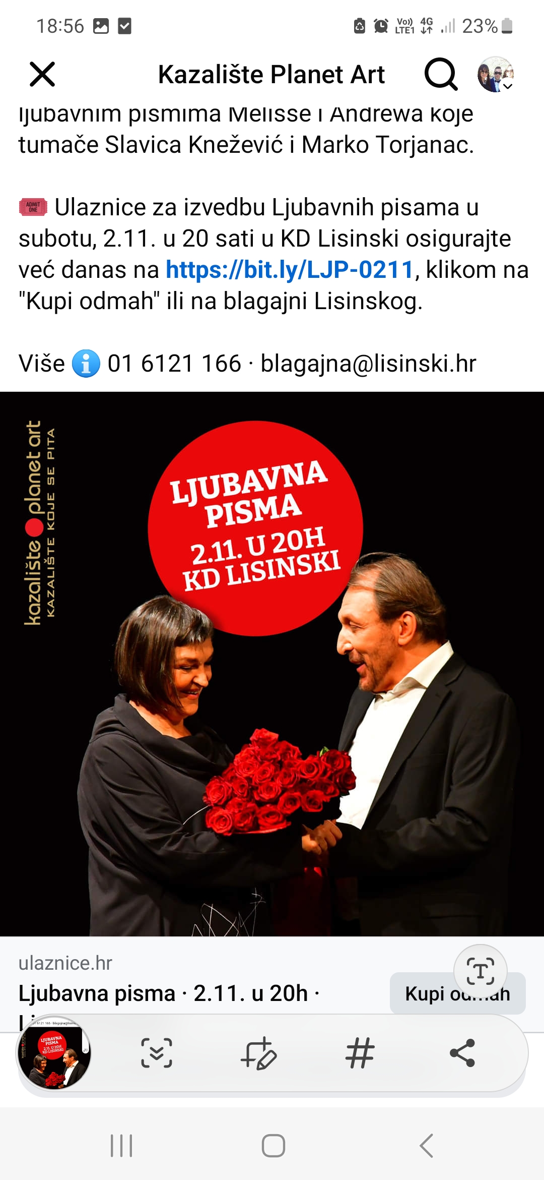 Predstava “Ljubavna pisma” odigrat će se 2. studenoga u 20 sati u KD Lisinski. Ulaznice možete osigurati putem interneta ili na blagajni Lisinskog. Požurite jer je interes za predstavu velik, a broj mjesta ograničen.