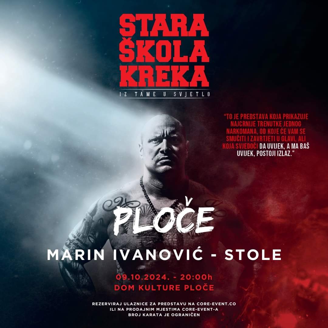 U srijedu, 9. listopada s početkom u 20 sati, Dom kulture Ploče ugostit će poznatog hrvatskog repera Marina Ivanovića Stoku, koji dolazi s potresnom i dirljivom predstavom “Stara škola kreka”. Ova predstava, utemeljena na njegovim osobnim iskustvima, prikazuje mračne trenutke života narkomana, oslikavajući put ovisnosti i borbu za izlazak iz nje.