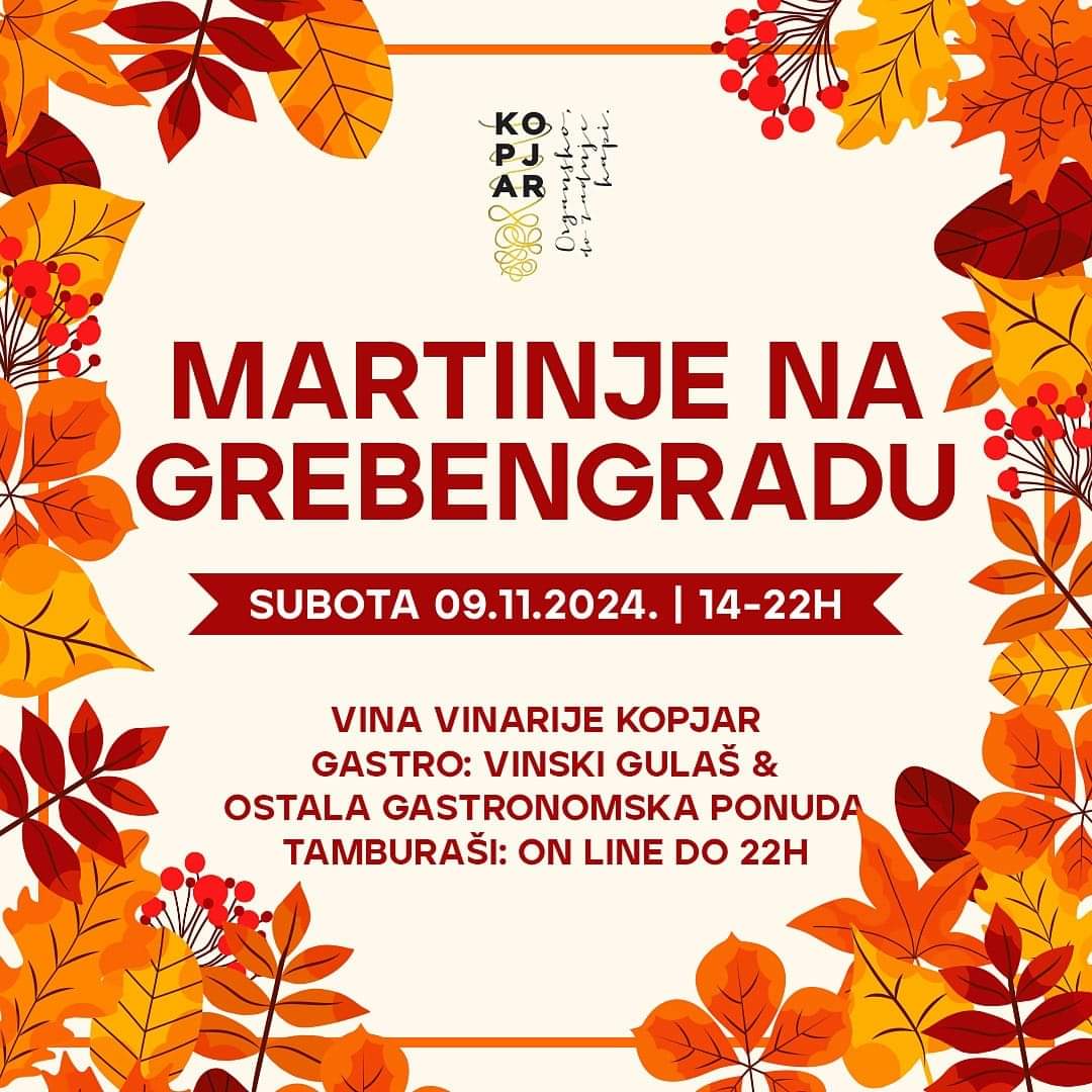 Vinarija Kopjar organizira proslavu Martinja na Grebengradu s početkom u 14:00 sati, a događanje traje do 22:00 sata. Na programu su vinski gulaš, ostale delicije, te nastup tamburaša “On Line” koji će zabavljati posjetitelje do kraja večeri. Ovo je savršena prilika za sve ljubitelje vina i gastronomije da uživaju u vrhunskim okusima u prekrasnom jesenskom ambijentu.