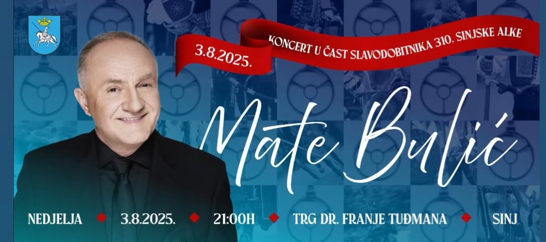 U nedjelju, 3. kolovoza 2025., legendarni pjevač Mate Bulić održat će veliki koncert na Trgu dr. Franje Tuđmana u Sinju s početkom u 21:00h. Ovaj glazbeni spektakl održava se u čast slavodobitnika 310. Sinjske Alke, povijesnog viteškog natjecanja koje je simbol časti, tradicije i hrvatskog identiteta.