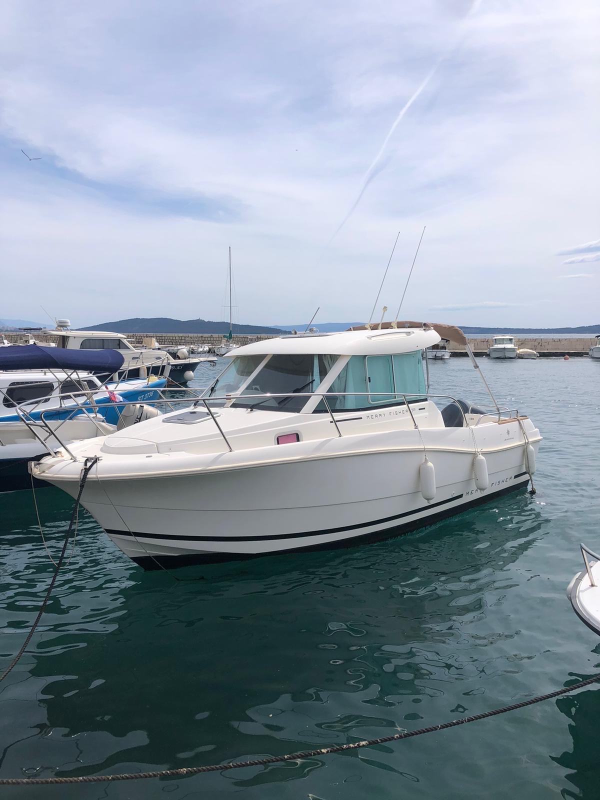 Prodaja broda Jeanneau Merry Fisher 725 u Trogiru. Yamaha 150 KS, 430 h, uredno servisiran, HR registracija. Cijena 43.900 €. Kontakt: 0915341746.