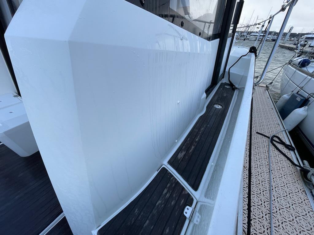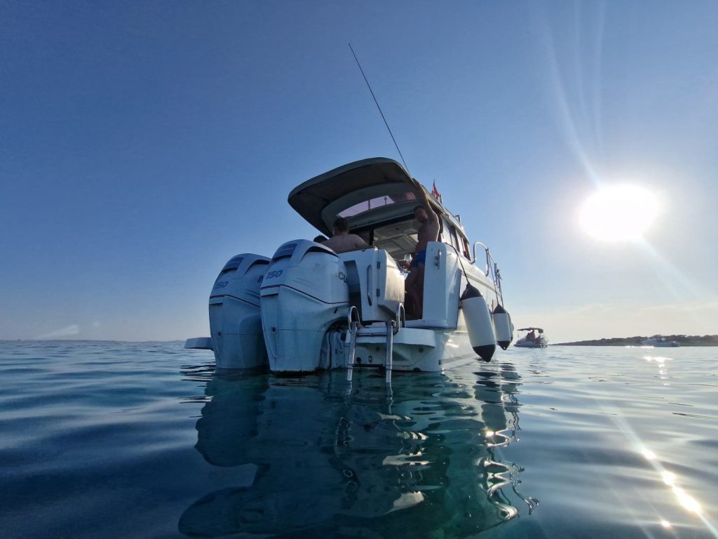 Ambijentalna rasvjeta krme i ispod linije mora dodatno naglašava premium dojam plovila, dok bogata oprema omogućuje ugodan boravak bez kompromisa. Električni WC, bojler, mikrovalna pećnica i TV osiguravaju razinu komfora kakva se rijetko nalazi u ovom segmentu.