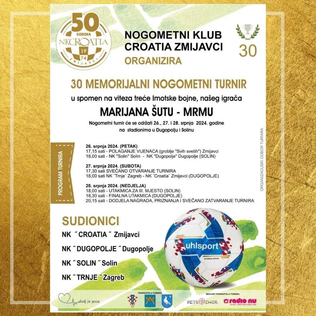 Osobita nam je čast sudjelovati na 30. memorijalnom nogometnom turniru u spomen na hrvatskog viteza Marijana Šutu – Mrmu. Turnir se ove godine zbog radova na terenu u Zmijavcima održava u Solinu i Dugopolju, a naš tim nastupa danas u 18 sati u Solinu protiv NK Solin.