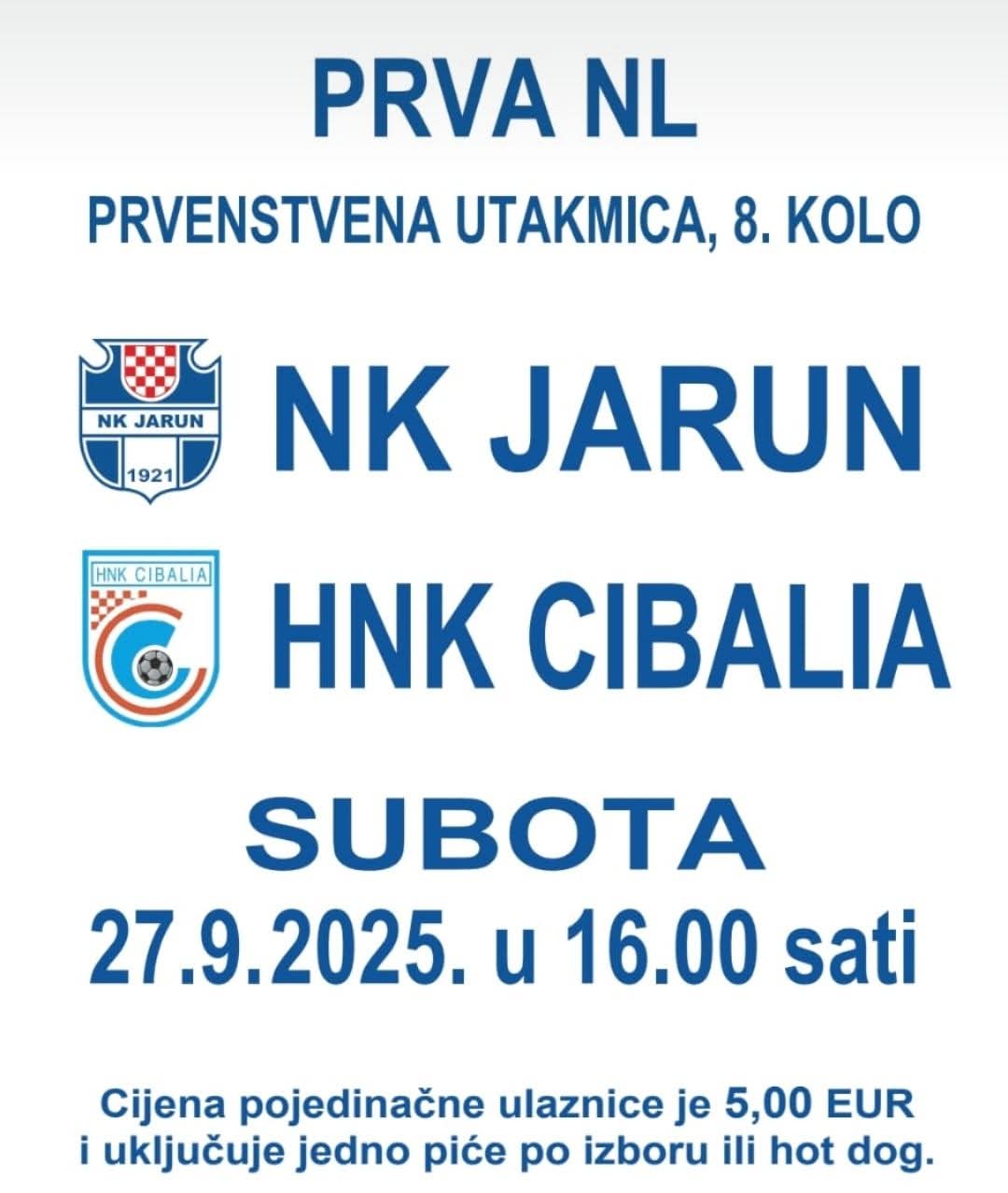 Dođite na prvenstvenu utakmicu 8. kola Prve NL – NK Jarun protiv HNK Cibalije! Subota, 27. rujna 2025. u 16:00 sati. Ulaznica 5 € uključuje piće ili hot dog. Ne propustite pravi nogometni spektakl u Zagrebu!