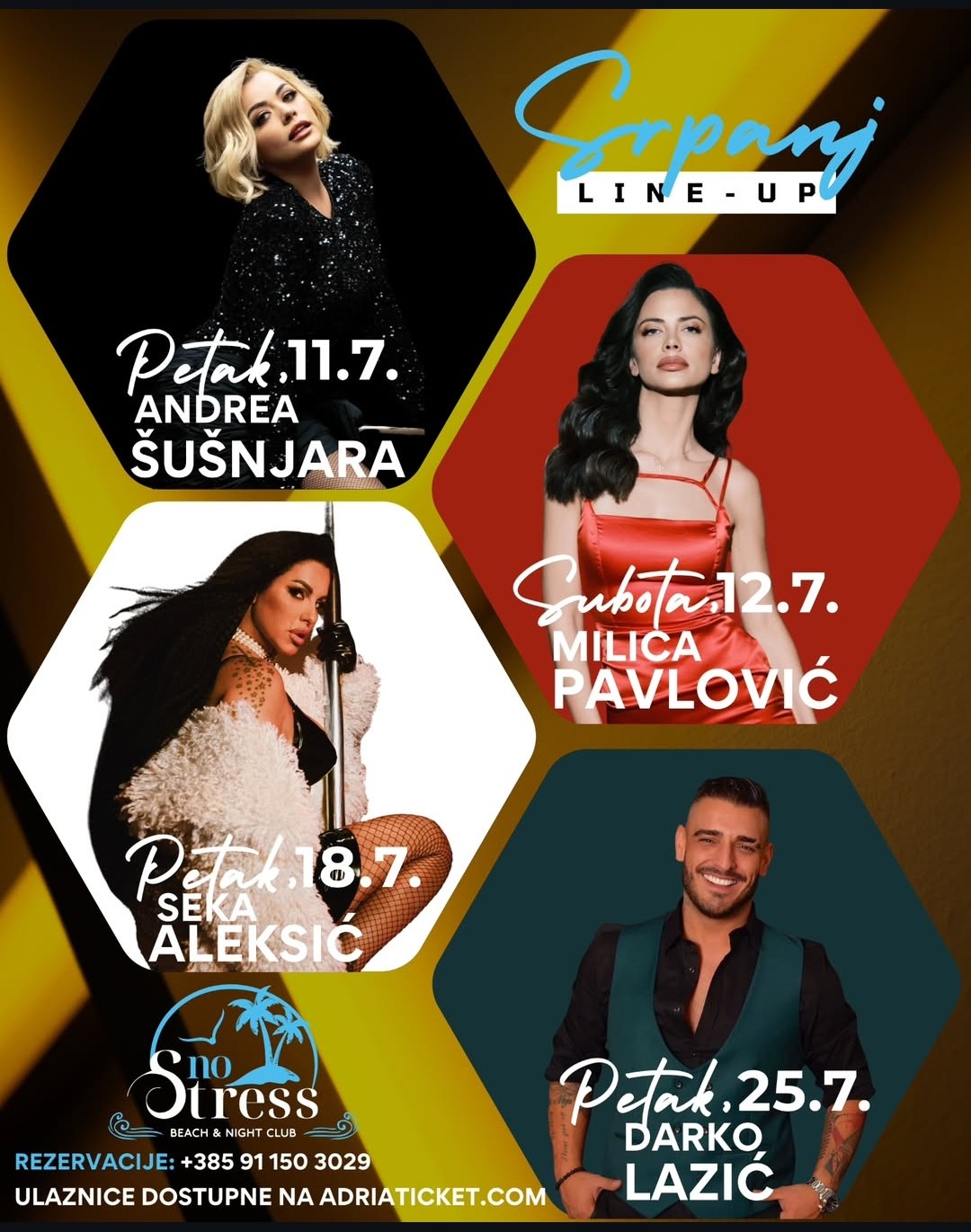 Ne propustite ljetne koncerte u No Stress Beach & Night Clubu! U srpnju 2025. stižu Andrea Šušnjara, Milica Pavlović, Seka Aleksić i Darko Lazić! Ulaznice na Adriaticket.com – rezerviraj na vrijeme!