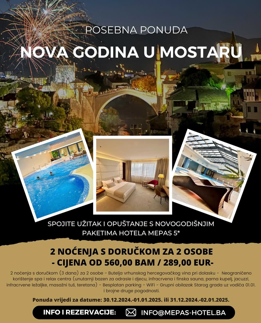 Hotel Mepas smješten je u srcu Mostara, što ga čini idealnom lokacijom za istraživanje ovog povijesnog grada. Uz luksuzne smještajne kapacitete, gosti imaju priliku uživati u autentičnim hercegovačkim okusima, modernim wellness sadržajima te nezaboravnom dočeku Nove godine.