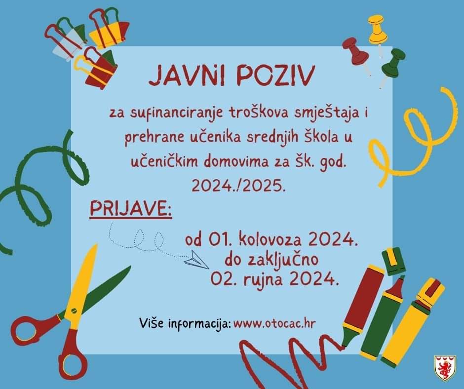 Odlukom gradonačelnika Grada Otočca, g. Gorana Bukovca, raspisuje se Javni poziv za sufinanciranje troškova smještaja i prehrane učenika srednjih škola u učeničkim domovima za šk. god. 2024./2025.
