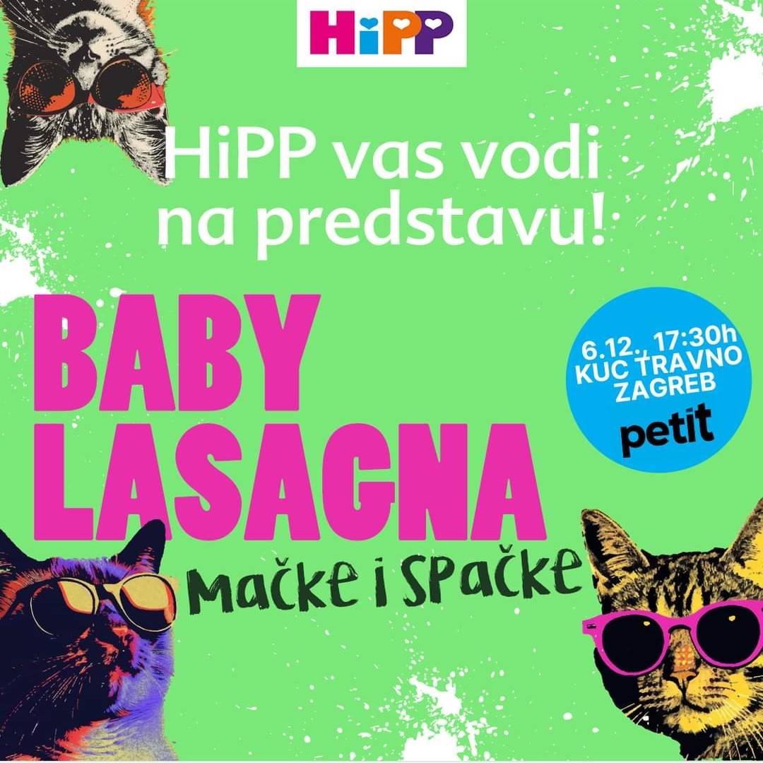 Poznati brend HiPP vodi vas na predstavu Baby Lasagna – Mačke i spačke, koja je već postala omiljena među mališanima! Ova vesela i poučna priča igra se 6. prosinca u KUC Travno u Zagrebu, a HiPP je pripremio besplatne ulaznice za sretne dobitnike. Pridružite se ovom nezaboravnom događaju i osigurajte mjesto za sebe i svoje najdraže!
