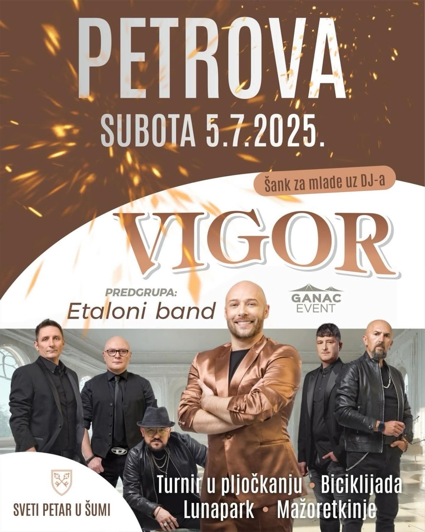 U subotu, 5. srpnja 2025., Sveti Petar u Šumi postaje središte nezaboravne proslave Petrova! Očekuje vas prava glazbena poslastica uz nastup popularne grupe Vigor, čiji hitovi pune plesne podije diljem Hrvatske. Prije Vigora publiku će zagrijati Etaloni band, a za vrhunsku atmosferu nakon koncerta pobrinut će se DJ uz šank za mlade.