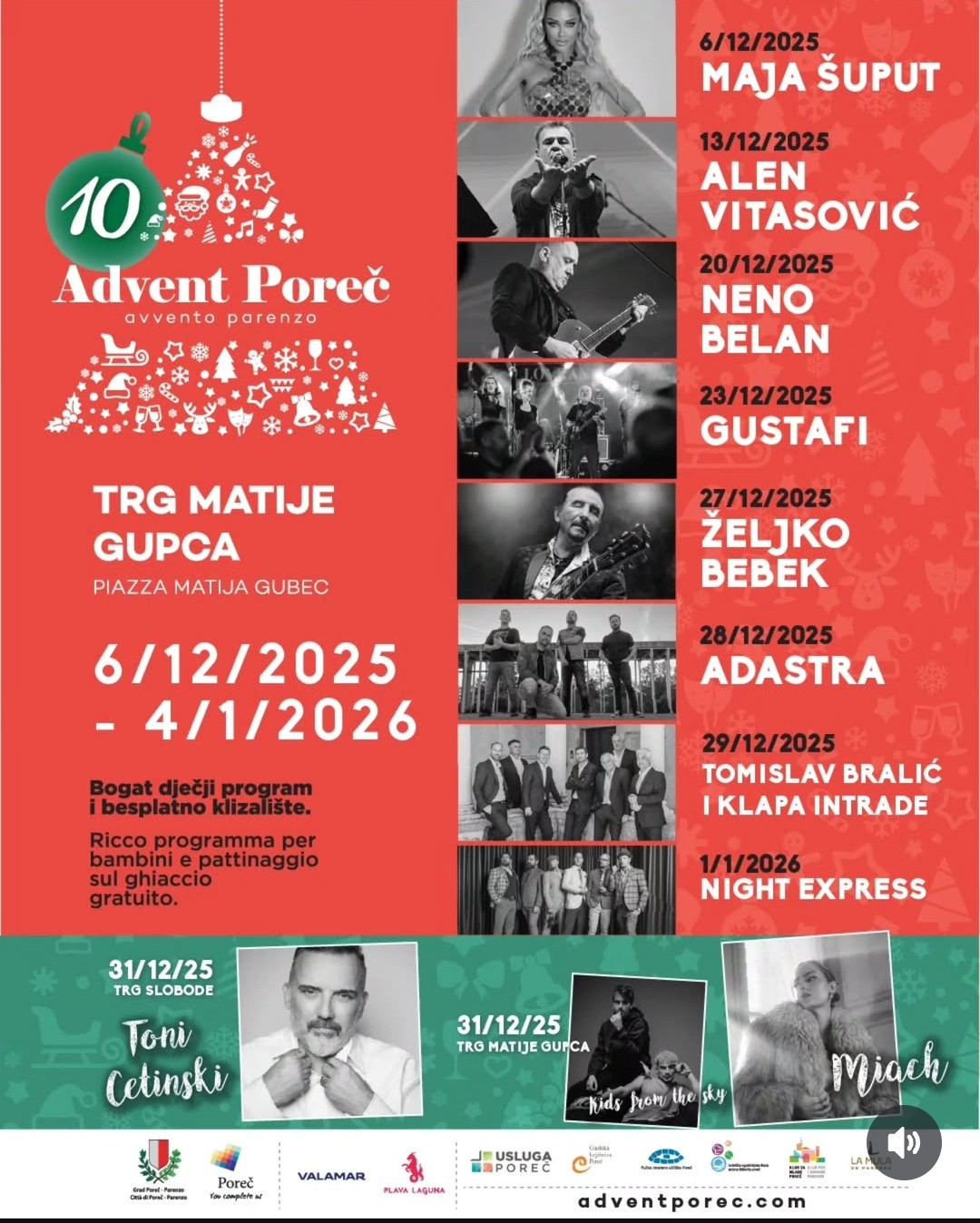 Advent Poreč 2025 donosi spektakularan program na Trgu Matije Gupca i Trgu Slobode! Nastupaju Maja Šuput, Neno Belan, Željko Bebek, Gustafi, Tomislav Bralić i klapa Intrade, te Toni Cetinski za doček Nove godine. Uživajte u besplatnom klizalištu, dječjem programu i blagdanskoj čaroliji Istre!