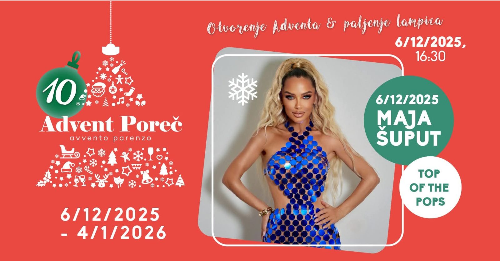 Posjetitelje očekuje pravo blagdansko iskustvo: tople lampice, bogato uređene kućice, mirisi zimskih delicija i posebno uređen bijeli paviljon koji će na dan otvorenja ugostiti zvijezdu večeri – Maju Šuput. Popularna hrvatska pjevačica poznata po energičnim nastupima otvara Advent Poreč uz program “Top of the Pops”, čime će prva adventska subota odmah donijeti vrhunsku atmosferu.