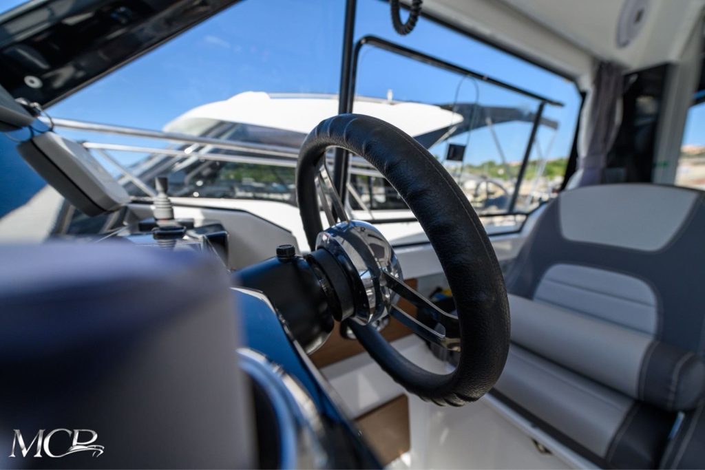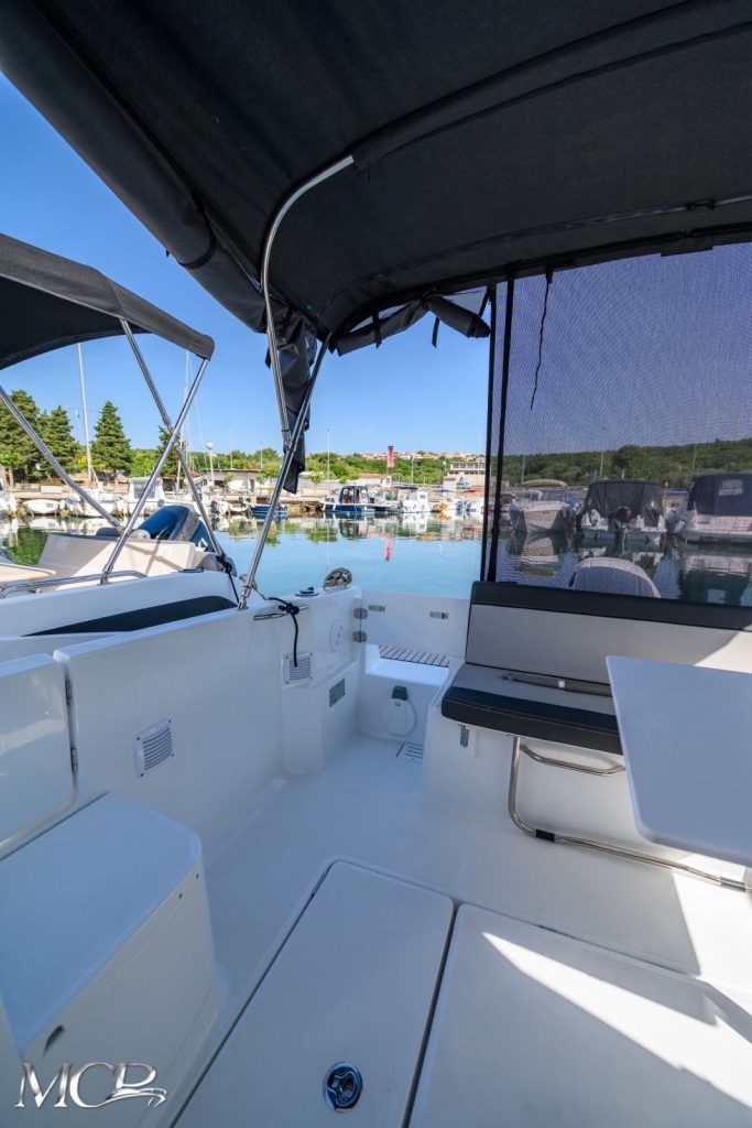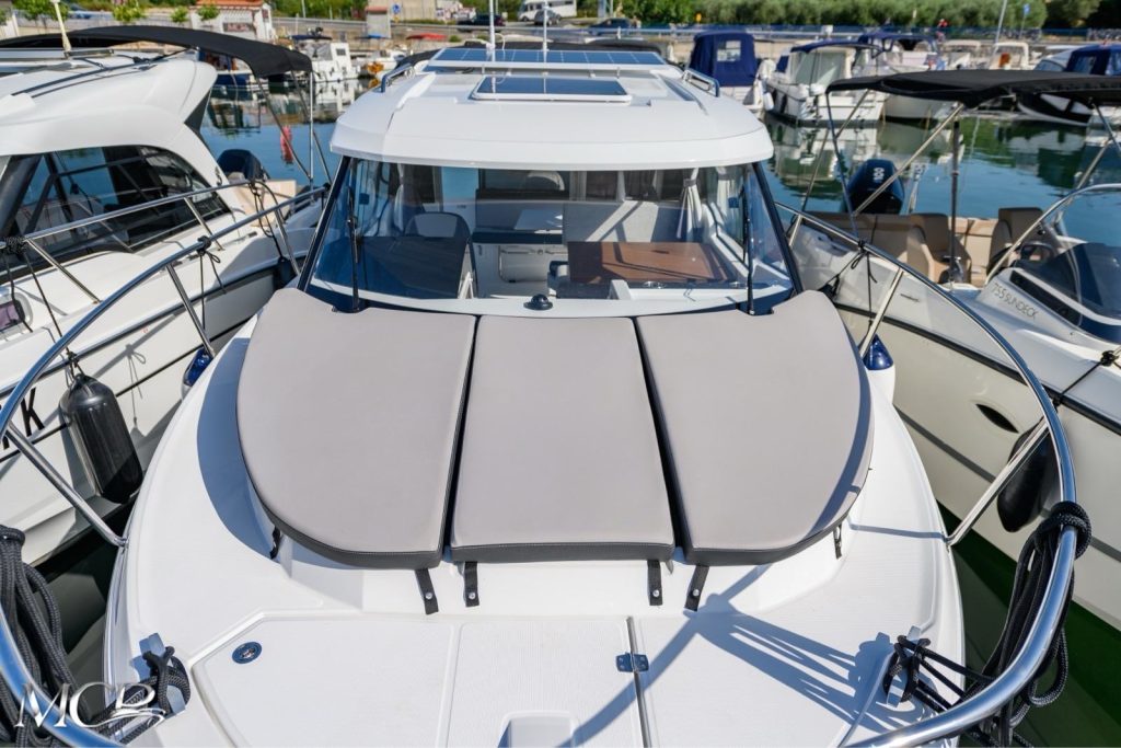 Posebna prednost ovog modela je funkcionalan raspored prostora – široki bočni prolazi, pametno organizirana kabina i praktičan kokpit omogućuju jednostavno kretanje i boravak na brodu. Unutrašnjost nudi dovoljno prostora za višednevni boravak, dok vanjski dio pruža udobnost za sunčanje i druženje.