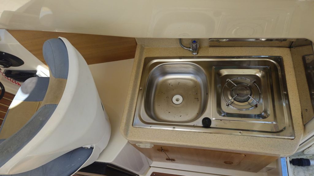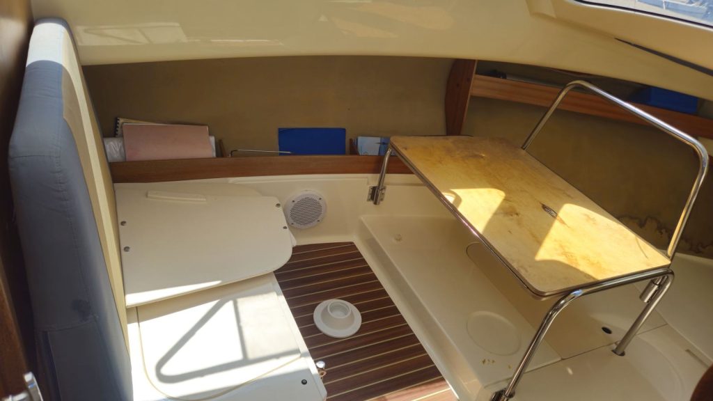 Unutarnji raspored omogućuje ugodan boravak na moru, s 4 ležaja, kabinom, kuhinjskim dijelom i električnim WC-om, dok je vanjski prostor prilagođen boravku i druženju zahvaljujući krmenom stolu, tušu i biminiju.