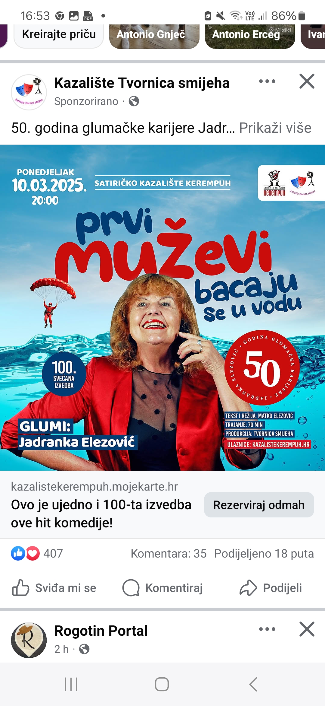 Kazališni hit “Prvi muževi bacaju se u vodu”, koji je osvojio srca publike širom Hrvatske, stiže do svoje 100. svečane izvedbe! Ova nezaboravna komedija, u kojoj briljira Jadranka Elezović, odigrat će se 10. ožujka 2025. u 20:00 sati u Satiričkom kazalištu Kerempuh u Zagrebu.