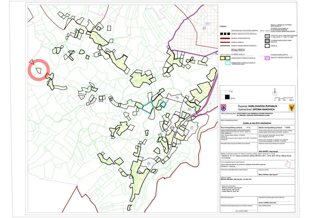 Zemljište se nalazi u građevinskoj zoni prema važećem prostornom planu Općine Rakovica. Moguća je gradnja obiteljske kuće ili kuće za odmor s turističkom namjenom. Minimalna veličina čestice iznosi 1000 m², a maksimalna izgrađenost do 30%.