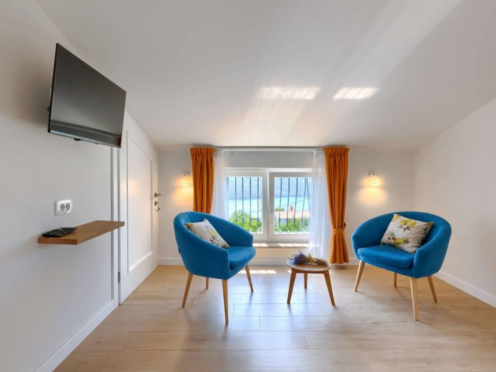 Na katu su dvije spavaće sobe, dvije kupaonice i terasa s pogledom na more, dok je u potkrovlju dodatna spavaća soba s vlastitom kupaonicom.