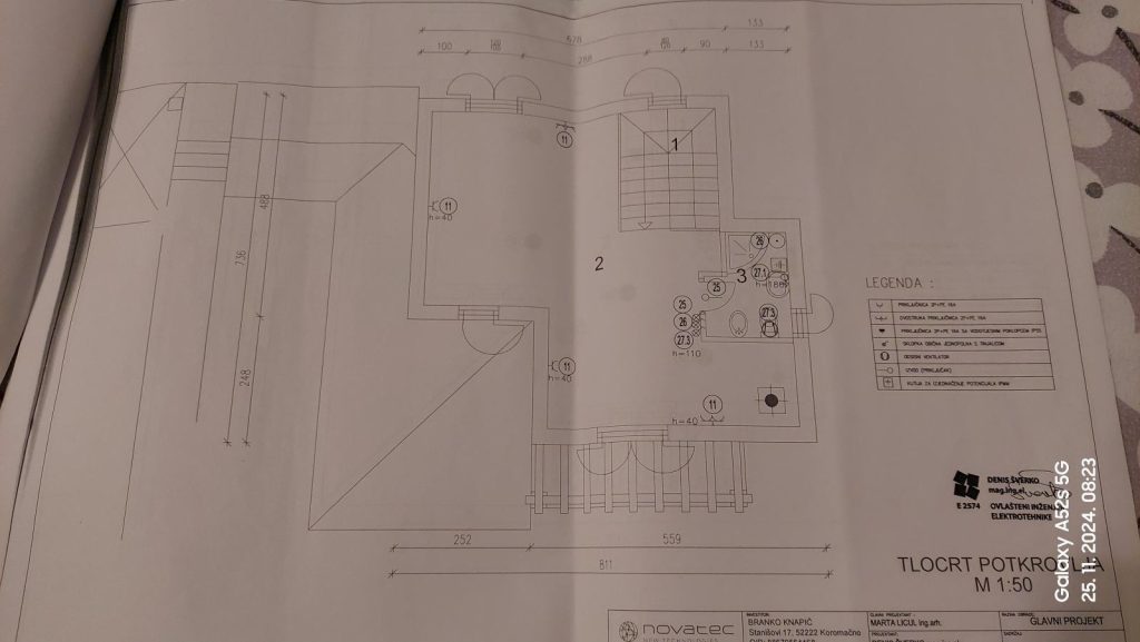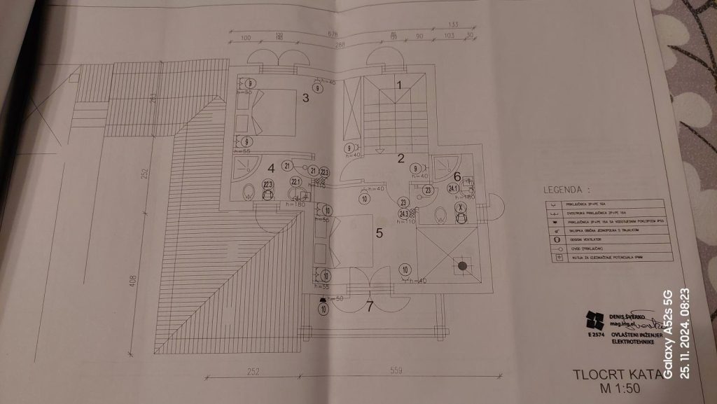 Kuća se prostire na tri etaže – prizemlje, kat i potkrovlje.