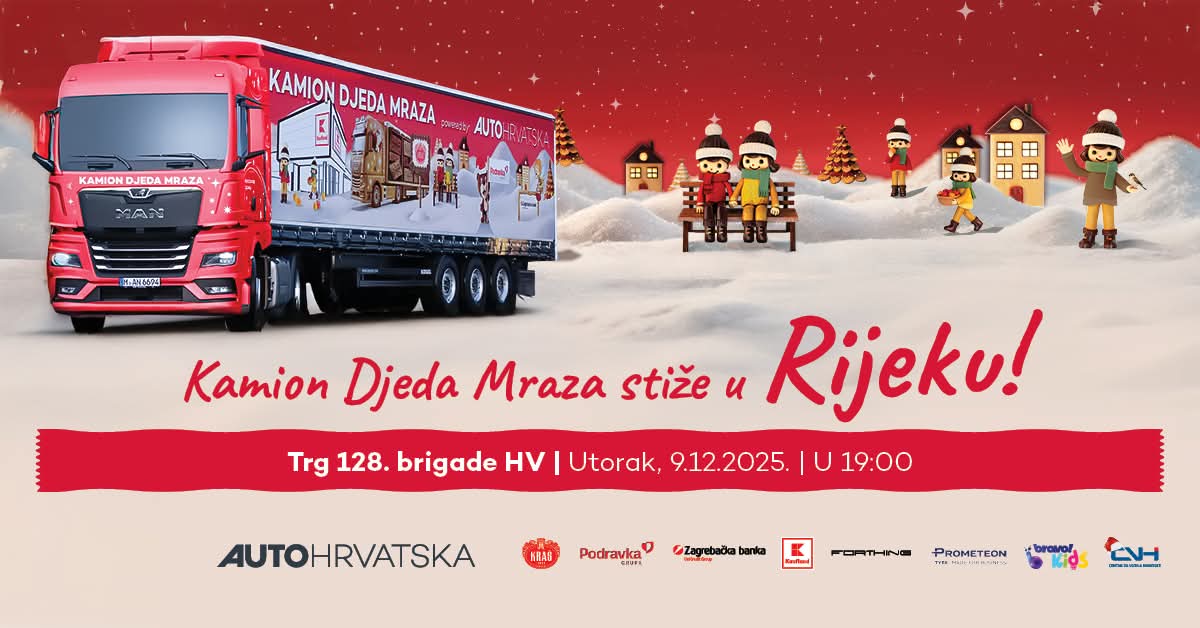 Rijeka se priprema za jedan od najveselijih blagdanskih događaja uoči Božića – spektakularni Kamion Djeda Mraza stiže u grad u utorak, 9. prosinca 2025., točno u 19:00 sati na Trg 128. brigade HV. Riječ je o velikoj blagdanskoj turneji koju zajednički organiziraju Auto Hrvatska, Podravka, Kraš, Zagrebačka banka i brojni partneri, a koja već godinama oduševljava djecu i odrasle širom Hrvatske.