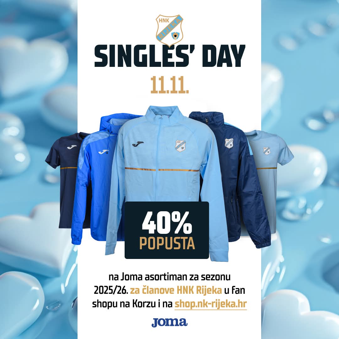 Povodom Singles’ Daya, HNK Rijeka pripremio je ekskluzivnu pogodnost za sve članove kluba! Samo 11. studenoga, ostvarite 40% popusta na cijeli Joma asortiman 2025/26. – u Fan shopu HNK Rijeka (P. R. Vitezovića 1b) ili putem webshopa shop.nk-rijeka.hr.