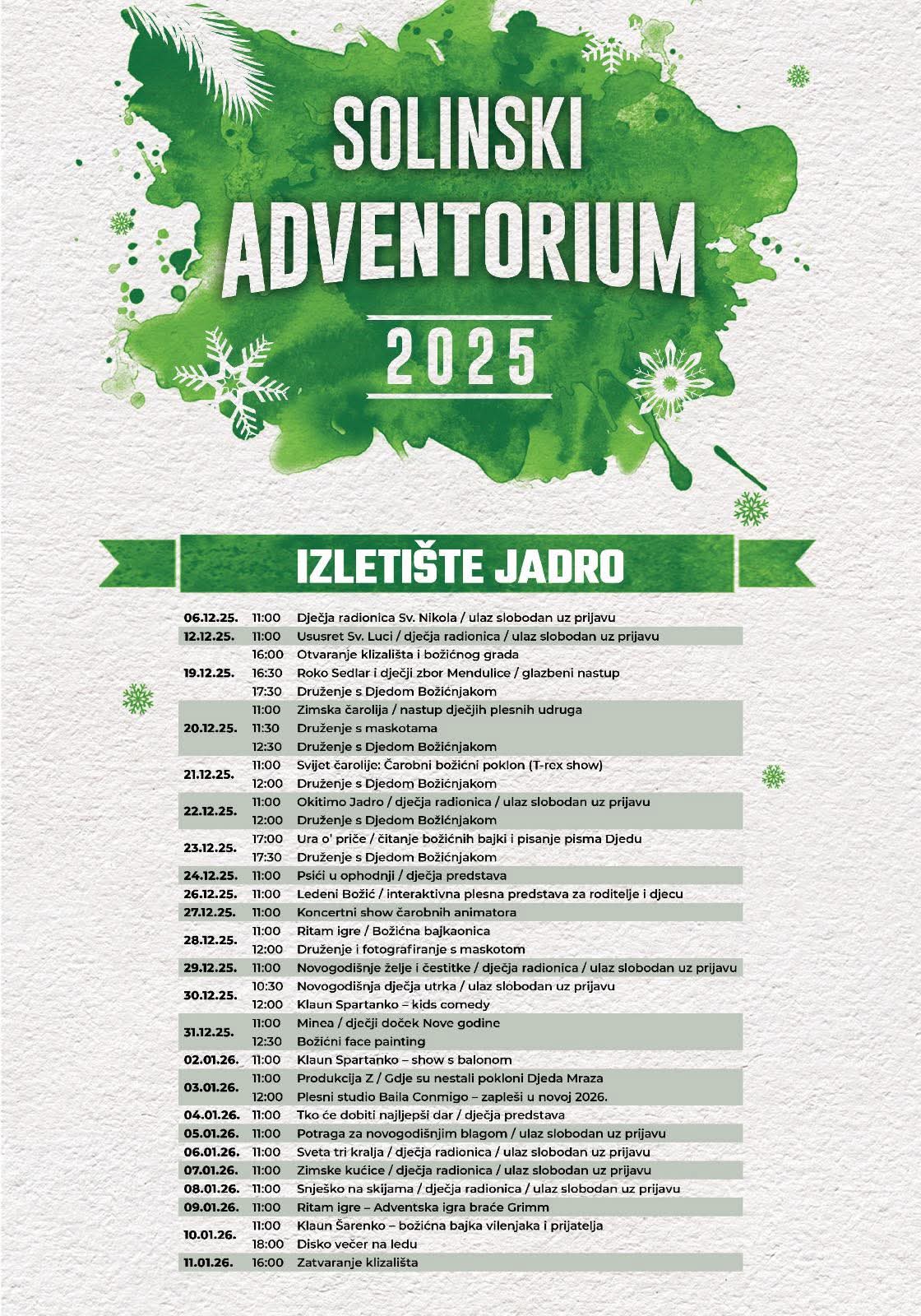 Posebnu pozornost privlači Badnjak na Jadro, 24. prosinca, kada je na rasporedu dječja predstava „Pčelica u ophodnji“, dok 25. prosinca slijedi „Ledeni Božić“, interaktivna plesna predstava za roditelje i djecu. Dan nakon toga posjetitelje očekuje koncertni show čarobnih animatora, a 27. prosinca tradicionalni Božićni face painting.