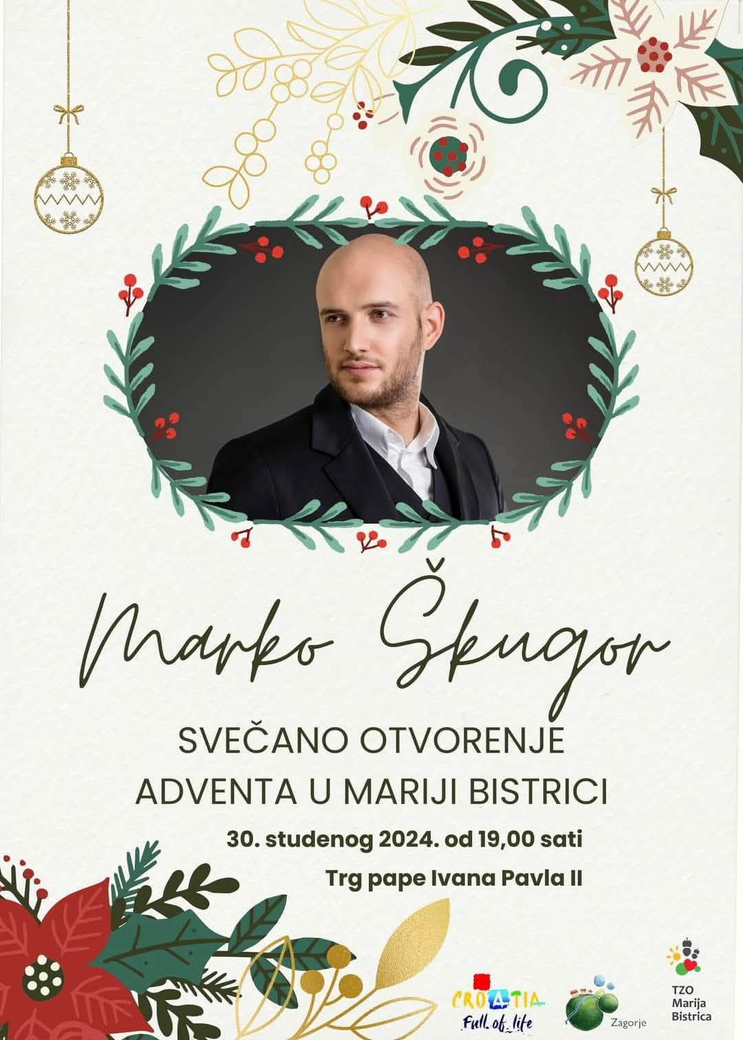 Pridružite se svečanom otvaranju Adventa u Mariji Bistrici, jednom od najposebnijih blagdanskih događanja u Zagorju! Ove godine, 30. studenog 2024., s početkom u 19:00 sati na Trgu pape Ivana Pavla II., posjetitelje očekuje spektakularan koncert Marka Škugora, jednog od najistaknutijih hrvatskih glazbenika.