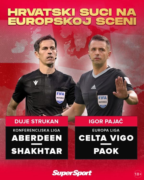 Hrvatski suci Duje Strukan i Igor Pajač ponovno su na velikoj europskoj sceni! Strukan vodi dvoboj Aberdeen – Shakhtar u Konferencijskoj ligi, dok...