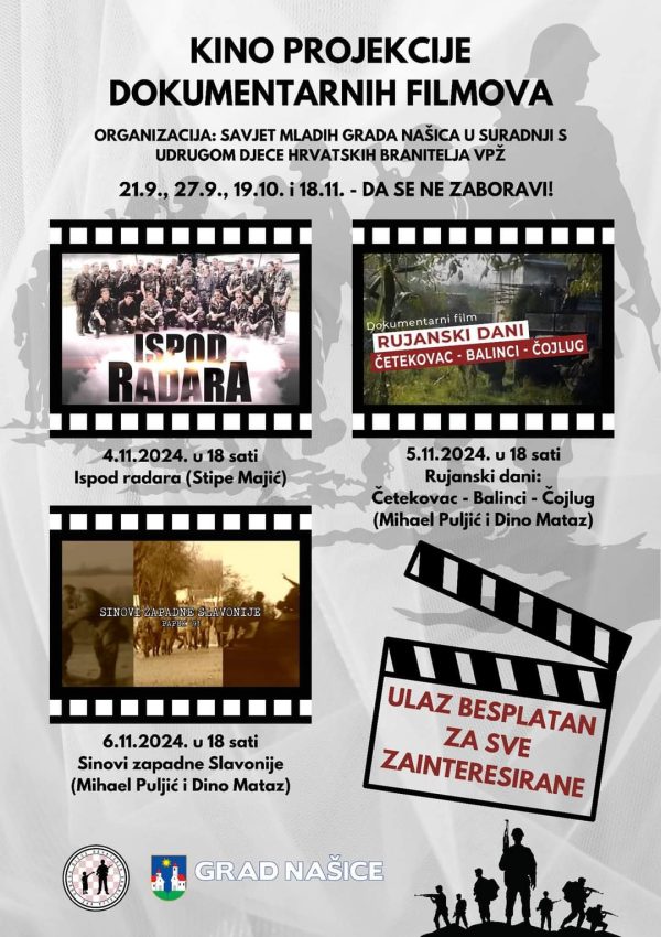 Grad Našice i Savjet mladih grada Našica u suradnji s Udrugom djece hrvatskih branitelja Virovitičko-podravske županije organiziraju besplatne projekcije dokumentarnih filmova u cilju...