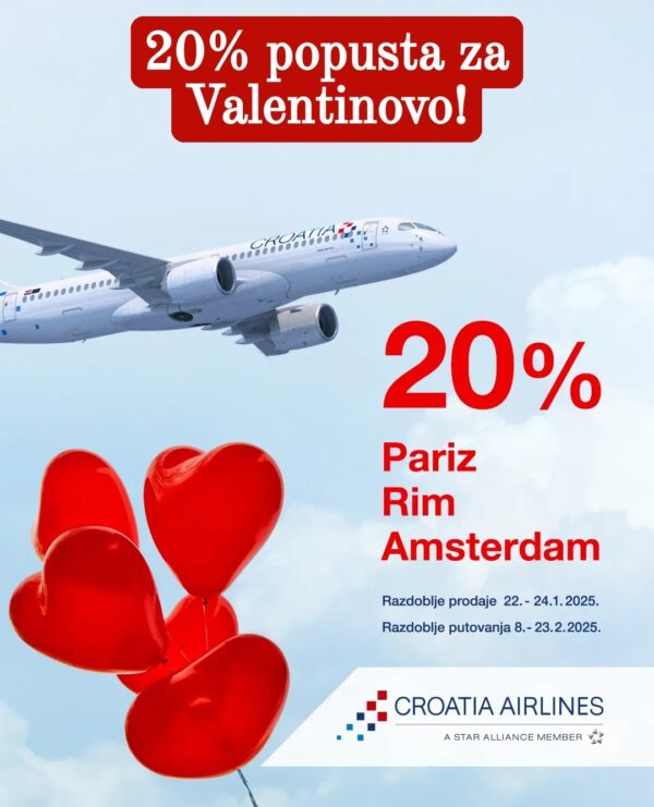 ByGradeMoj14 veljače, 2025Proslavite Valentinovo uz 20% popusta na letove Croatia Airlinesa! Planirate romantično putovanje za Valentinovo? Croatia Airlines nudi savršenu priliku za nezaboravan bijeg s...