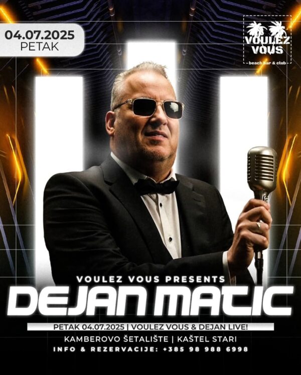 Veliki koncert Dejana Matića 4. srpnja 2025. u klubu Voulez Vous, Kaštel Stari! Ne propustite nezaboravnu glazbenu večer uz hitove uživo. VELIKI KONCERT...