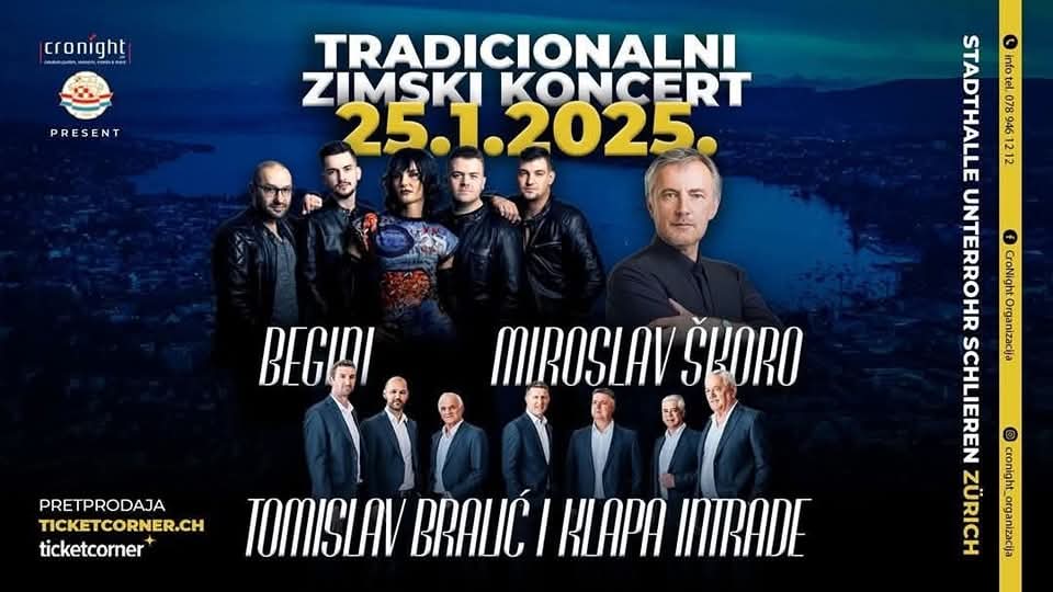 Ljubitelji hrvatske glazbe u Švicarskoj doći će na svoje 25. siječnja 2025. kada će se održati Tradicionalni Zimski Koncert u prestižnoj dvorani Stadthalle Unterrohr Schlieren u Zürichu. Na ovom spektakularnom događaju nastupit će neka od najvećih imena domaće glazbene scene: Miroslav Škoro, Tomislav Bralić i Klapa Intrade, te popularni Begini.