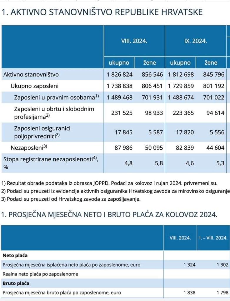 Tržište rada u Hrvatskoj za kolovoz i rujan 2024.: Zaposlenost, Nezaposlenost i Prosječna Plaća
