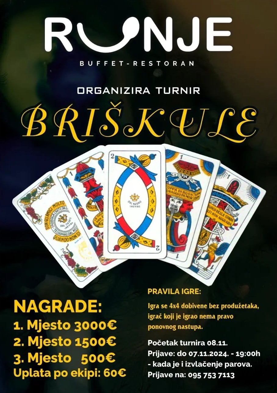 Buffet Restoran Runje u Zmijavcima organizira veliki turnir u briškuli s primamljivim novčanim nagradama. Svi ljubitelji ove tradicionalne kartaške igre imat će priliku pokazati svoje vještine i boriti se za prvo mjesto, čija nagrada iznosi čak 3000 eura! Drugo i treće mjesto također će biti bogato nagrađeni s 1500 i 500 eura.