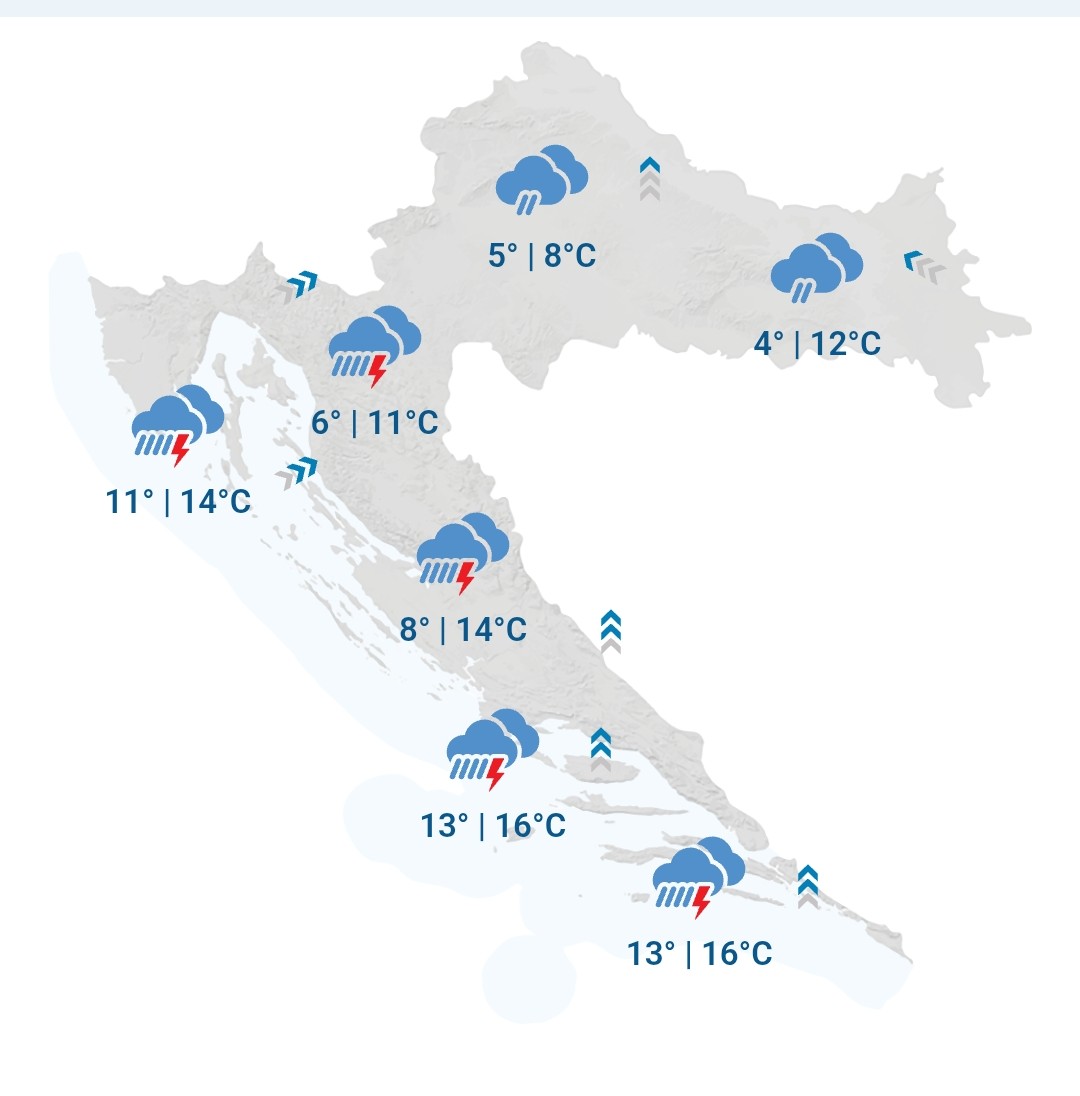 Najviše kiše prognozira se na području Istre, Kvarnera i Dalmacije, gdje pljuskovi mogu biti praćeni grmljavinom i kratkotrajnim olujnim udarima vjetra. U višim predjelima Gorskog kotara i Like povremeno je moguća susnježica, ali bez stvaranja snježnog pokrivača. Navečer će na sjevernom Jadranu doći do djelomičnog razvedravanja, dok će ostatak zemlje stabilizaciju osjetiti tijekom noći.